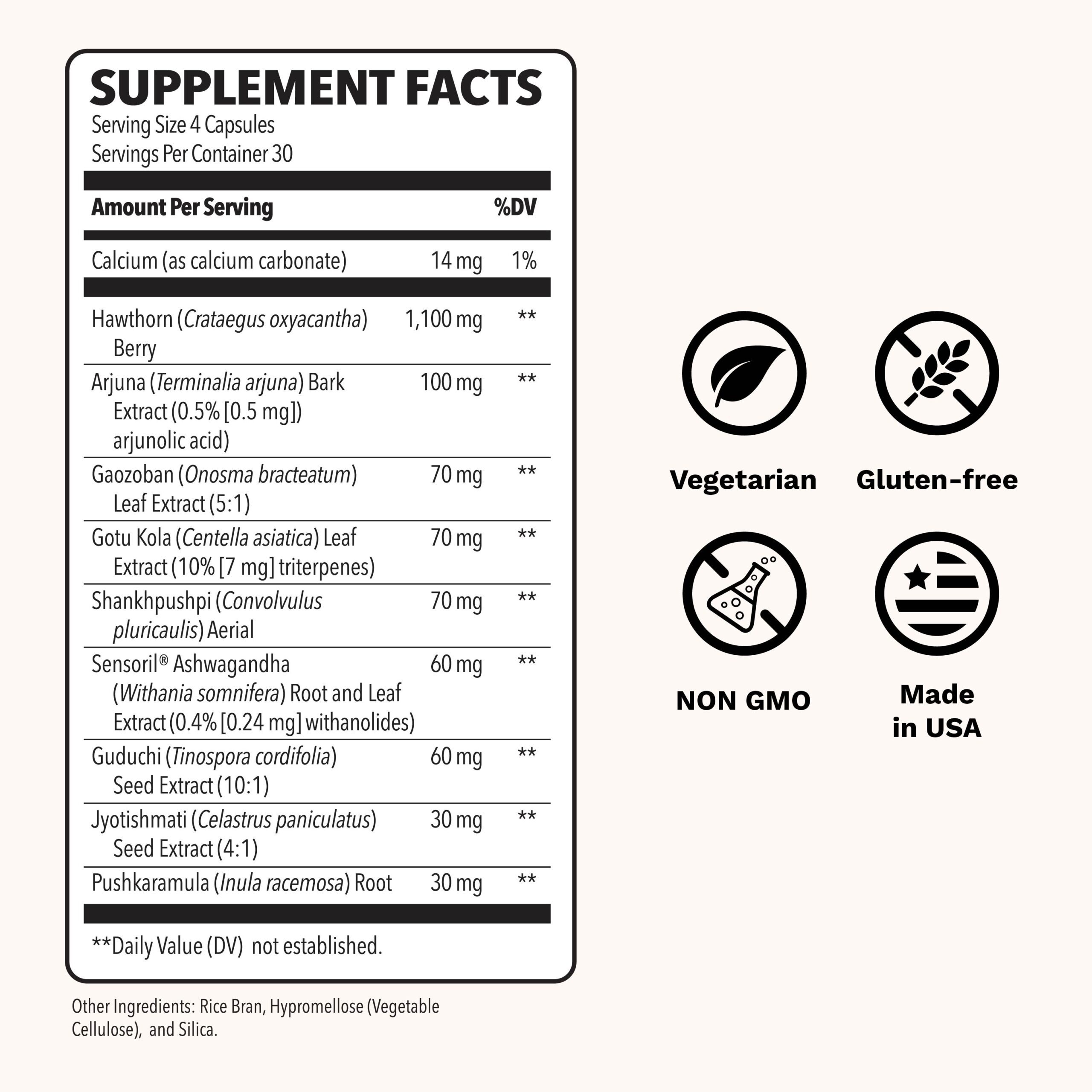 We use herbs like Arjuna, Ashwagandha, and Hawthorn Berry that work together to support normal blood pressure. These are plants that have been used for centuries to help hearts stay healthy.